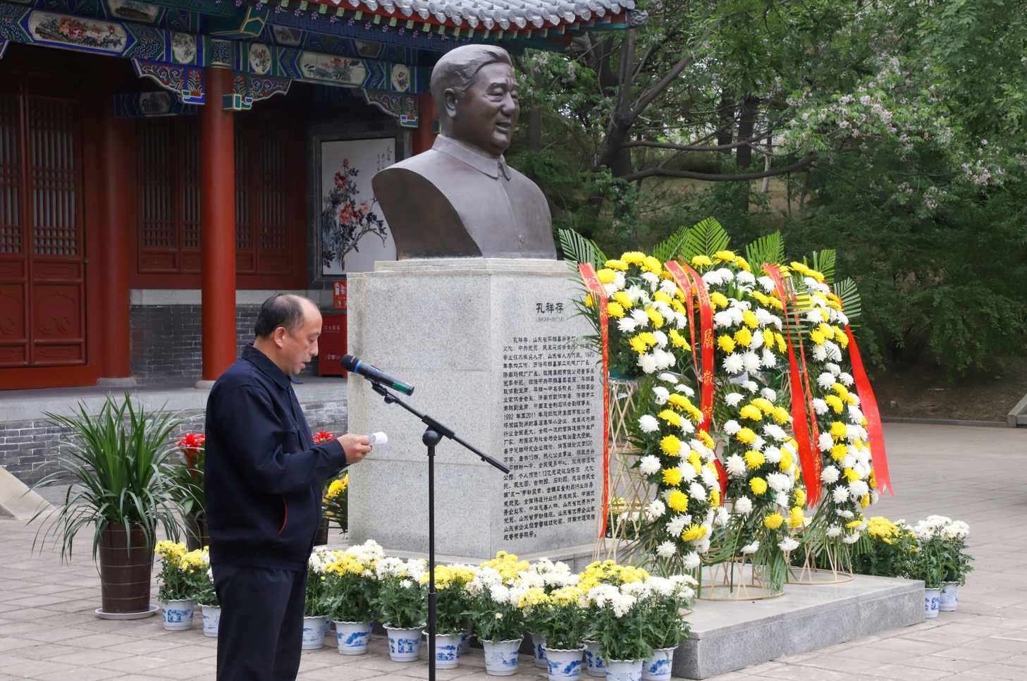 2022年5月8日,在玫德工业科技城科技园花果山桃花源赏石品茗轩广场举行荣誉董事长孔祥存先生逝世五周年缅怀仪式。玫德集团驻平阴地区、玫德晨晖高管及外聘中层70余名干部参加仪式。仪式由玫德集团母公司总经理李传军主持,玫德集团党委书记、董事局副主席刘勇做重要讲话。