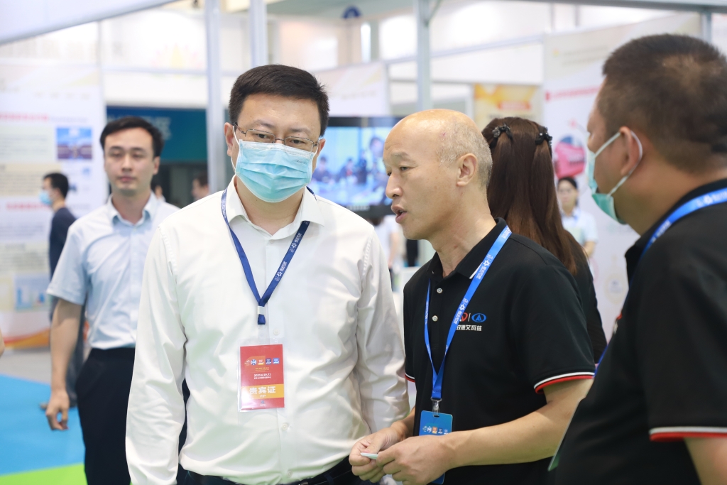中国国际贸易促进委员会济南市分会副会长张喆莅临玫德展区考察,并作出指导,玫德艾瓦兹(济南)金属制品有限公司总经理田玉臣进行介绍与讲解。