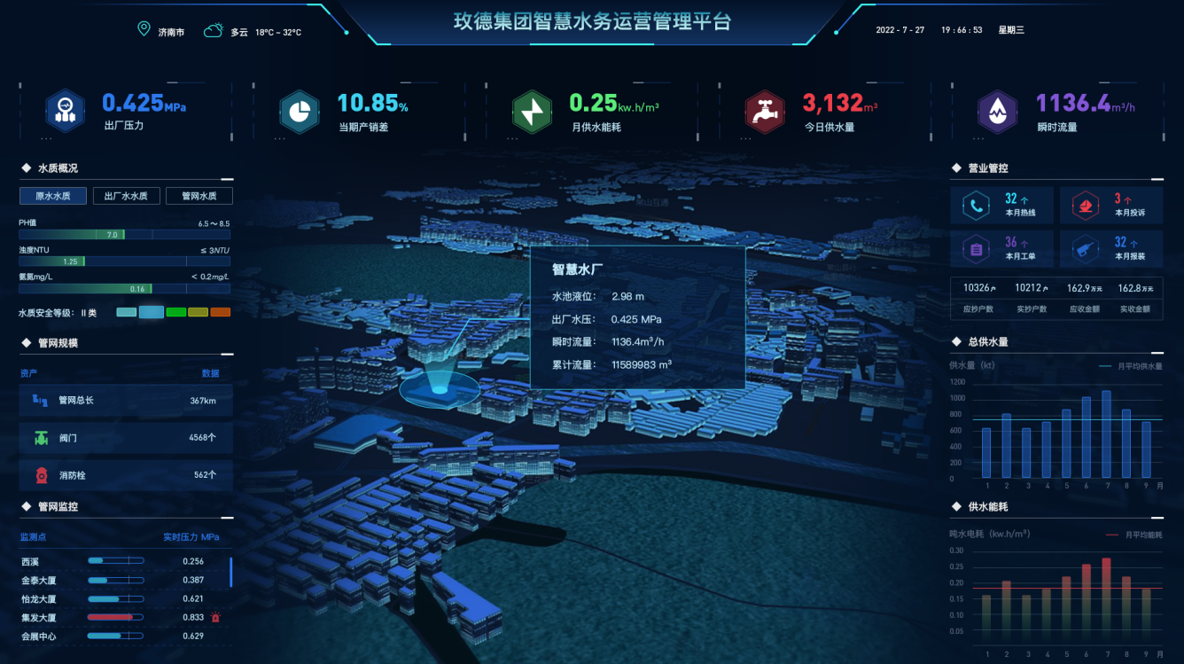 随着城镇化发展,我国城市供水持续增长,供水管网迅速扩张,但不少城市供水管网漏损率较高。为进一步加强公共供水管网漏损控制,提高水资源利用效率,玫德开发了这款城市供水综合管理平台。该平台结合玫德在物联网、大数据、云计算等先进技术方面的沉淀,实现城市供水管网科学化、精细化和统一化的管理以及数据的共享共用。平台整合水源、水厂、生产工艺数据的监控与调度,管网压力、流量、水质的监控,加压泵站、二次供水设备的远程监管,大用户流量的数据监测,居民用户远传的自动抄表,实现了从水源到水龙头全流程的监管监控。