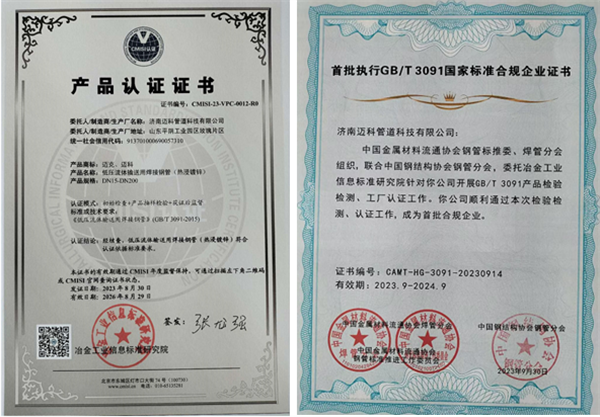 为了促进企业规范经营,维护国标产品形象和合规企业公信力、竞争力,保障用户合法权益,2023年3月15日,由中国金属材料流通协会焊管分会牵头,联合中国钢结构协会钢管分会、冶金工业信息标准研究院及国内主要焊管企业,正式启动了行业首个自律规范组织——中国金属材料流通协会钢管标准推进工作委员会(简称“中金协钢管标推委”),随后组织开展了GB/T 3091-2015产品认证工作。2023年10月16日,由四大权威机构联合发布的首批入围《执行GB/T 3091国家标准合规企业名录》的14家企业中,济南迈科管道科技有限公司成为首批执行GB/T3091国家标准并获得钢管标推委认证合规企业之一,同时获得中国金属材料流通协会授权使用“STS(钢管标准)”集体商标。
