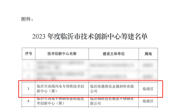 近日,临沂市科学技术局下发“2023年度临沂市技术创新中心筹建名单”,临沂玫德庚辰金属材料有限公司的“临沂市高端风电专用铁技术创新中心”成功入选。
