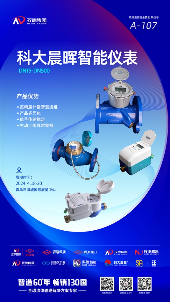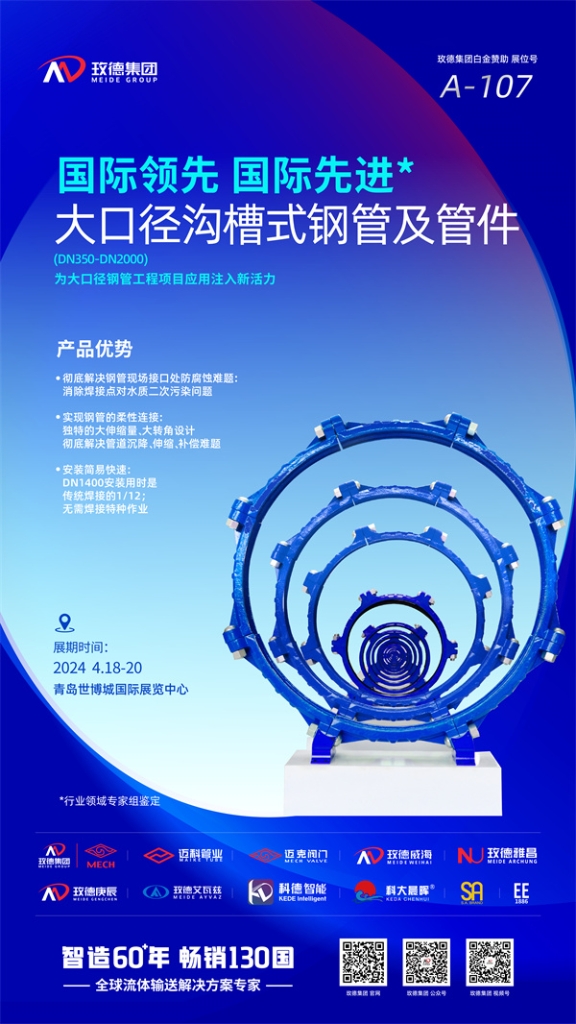 2024年4月18日-20日,玫德集团作为白金赞助商携手中国水协在青岛召开中国城镇供水排水协会2024年会暨城镇水务技术与产品交流展示会。届时玫德集团会展出大口径沟槽式钢管及管件、科大晨晖智能仪表、水务领域智能阀门、不锈钢管材管件、智慧水务整体解决方案等软硬兼具的一站式产品及解决方案。
