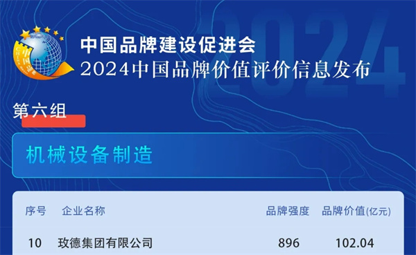 玫德集团名列“机械设备制造组”荣誉榜,品牌价值102.04亿元,品牌价值由2023年的93.69亿元增长了8.45亿元。