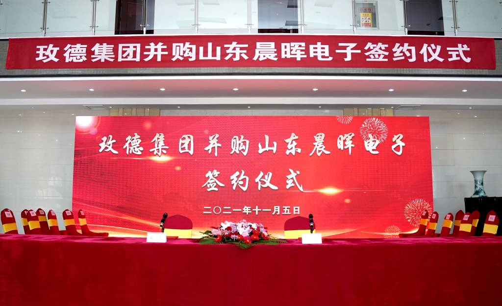 On November 5th, 2021, “the signing ceremony of Meide Group's acquisition of Shandong Chenhui Electronics Technology Co.,Ltd” was held in Tai'an, Shandong. Mr. Kong Linglei, the Chairman of the Board of Directors of Meide Group, Mr. Liu Yong, Mr. Qi Xiaoyu, Mr. Chang Cheng, Mr. Hu Wenyou, the Vice Chairman of the Board of Directors of Meide Group, and Mr. Wang Xueshui, the former Chairman of Shandong Chenhui Electronics, Mr. Zhang Junzhao the General manager of Shandong Chenhui Electronics, etc attended the ceremony. Under the witness of the guests, Meide group announced the acquisition of Shandong Chenhui Electronics Technology Co.,Ltd.