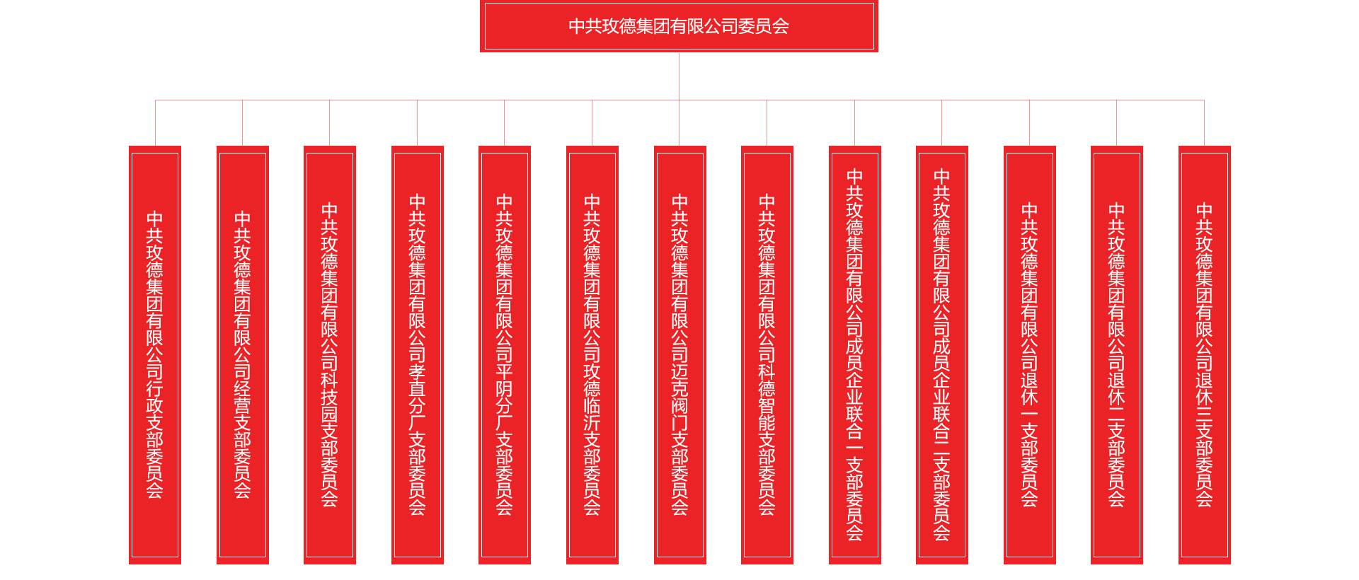 1.中共玫德集团有限公司行政支部委员会 2.中共玫德集团有限公司经营支部委员会 3.中共玫德集团有限公司科技园支部委员会 4.中共玫德集团有限公司孝直分厂支部委员会 5.中共玫德集团有限公司平阴分厂支部委员会 6.中共玫德集团有限公司玫德临沂支部委员会 7.中共玫德集团有限公司迈克阀门支部委员会 8.中共玫德集团有限公司科德智能支部委员会 9.中共玫德集团有限公司成员企业联合一支部委员会 10.中共玫德集团有限公司成员企业联合二支部委员会 11.中共玫德集团有限公司退休一支部委员会 12.中共玫德集团有限公司退休二支部委员会 13.中共玫德集团有限公司退休三支部委员会